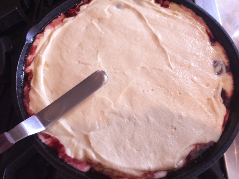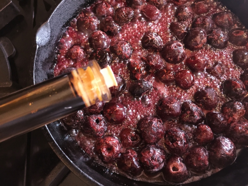 1. Preheat oven to 350 degrees.  In a cast iron pan or other skillet, add 2 tablespoons butter and 1/2 cup sugar.  Place over medium heat and cook until melted, and edges of sugar begin to brown.  Add cherries and spread out evenly, cook for 3 minutes.  Drizzle vinegar over cherries and cook for 1 minute. Remove pan from heat.