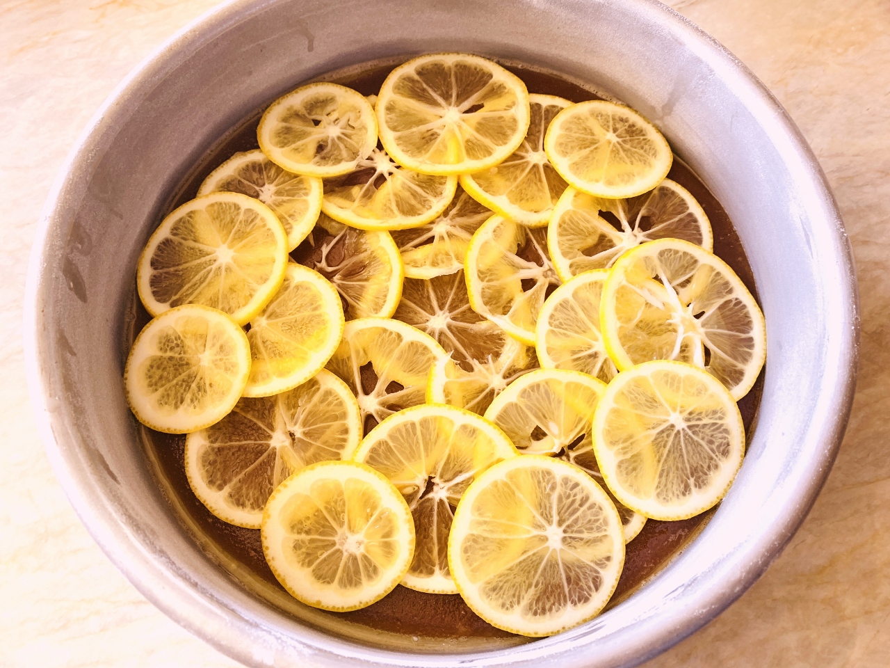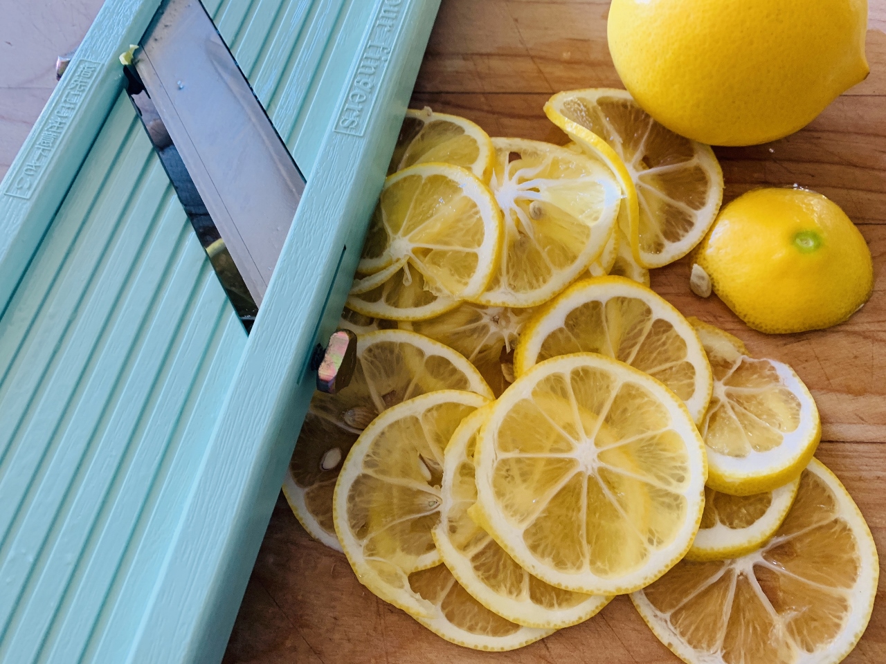 - Slice lemons using a mandoline or sharp knife wafer thin, about 1/8 inch thick and remove seeds. Starting in center of pan place lemons in a concentric circle. Set aside.