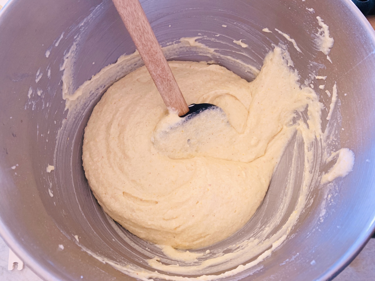 - In a stand mixer or large bowl, cream together butter, sugar and lemon zest for 3 minutes. Scrape down sides of bowl and add eggs one at a time.