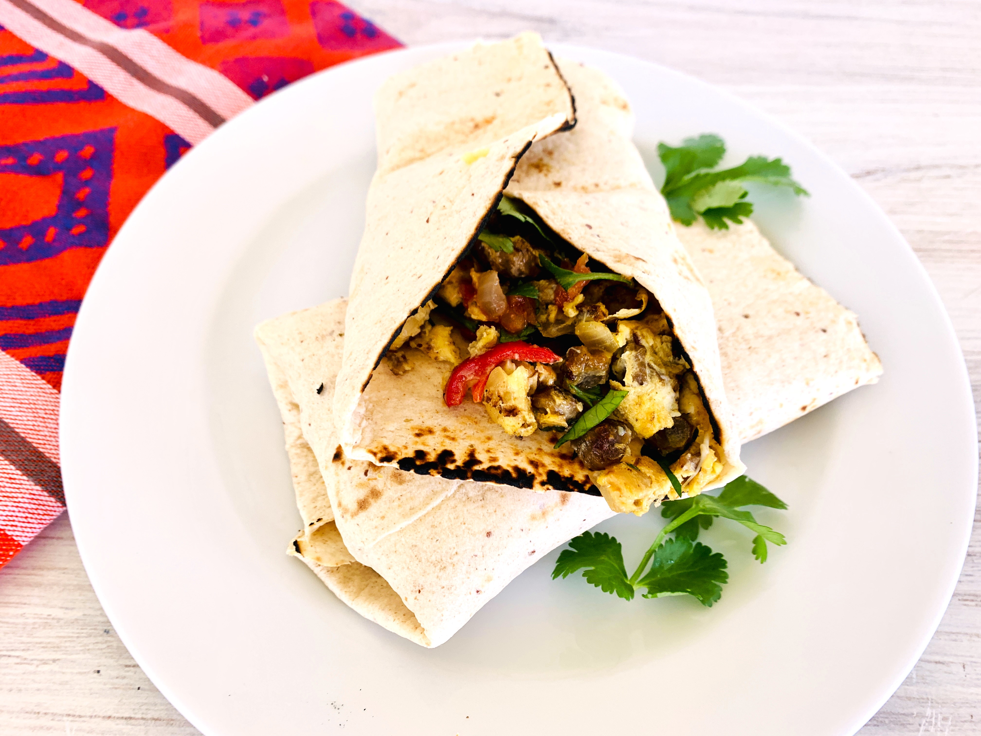 I started with Beyond Beef Crumbles, but you can use any type of vegetarian or vegan ground meat alternative. I sauteed the crumbles with an onion and a sliced chili pepper, then added beaten eggs to create an delicious filling for a morning burrito. I used freshly diced avocado, salsa and cilantro leaves to top it all off, before I rolled it up for serving. You can make a big skillet of this vegetarian machaca and let your family or friends spoon it into their own shell or roll them all up for them, and serve them on a big platter or wrap one in a paper towel to-go.