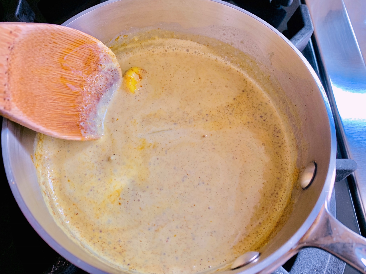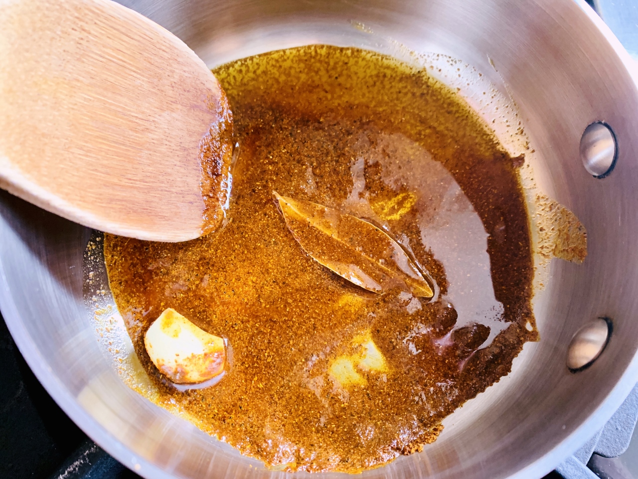 - Preheat oven to 375 degrees. In a small saucepan, add oil, vindaloo, bay leaf and garlic and place over medium-low heat. Cook for 1 minute to hydrate dry spices, stir. Add cream and cook for 3 minutes, allowing mixture to simmer slowly. Remove from heat and set aside to steep (infuse) for 10 minutes.