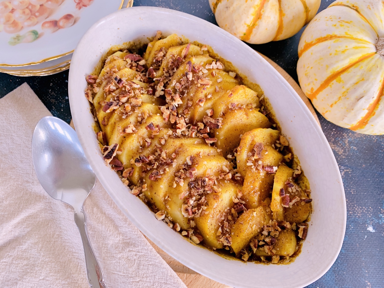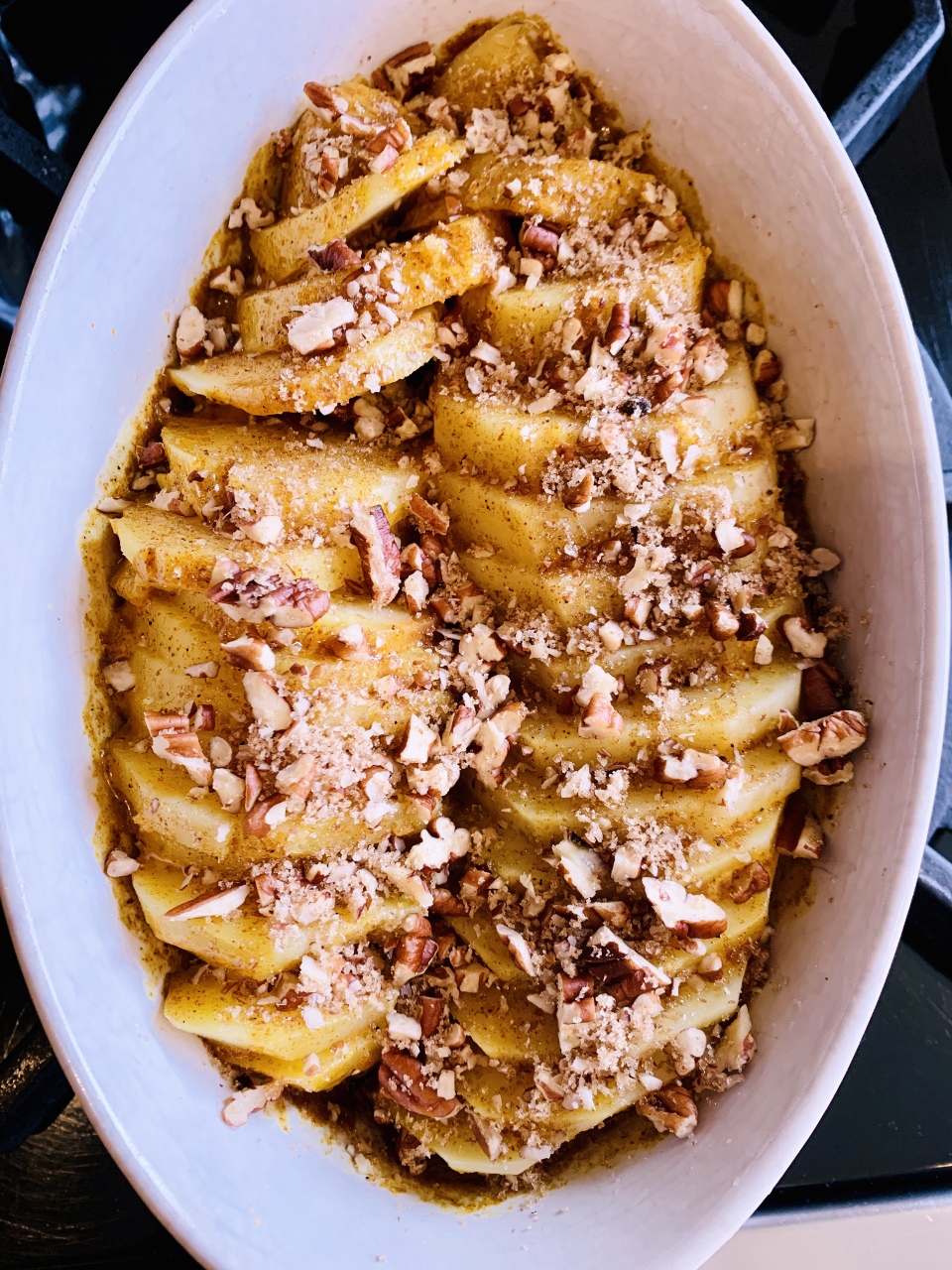 This scalloped sweet potato dish is definitely different in a good way. The layers of flavor are decadent, and complimentary to each other with hints of sweet and spice throughout. To prepare this recipe, I par-baked the sweet potatoes ahead to cut down on same-day oven time, and the vindaloo sauce in made on the stove top, and ladled over the potatoes before baking. To finish this dish, a final dusting of brown sugar pecans are sprinkled over top with a quick brulee under the broiler, which can be done right before serving.