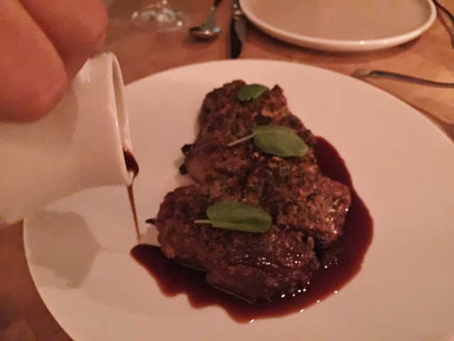 The menu had an overall shared plates theme, starting with the Raw section. There was a choice of two different tartars – a Tuna and a Beef, a Pastrami-Style Salmon Tartine (which I thought looked interesting) and a Foie Gras Torchon. The Beef Tartar was amazing! The large chunks of raw steak were tossed with a mushroom duxelle, raw egg and caperberries. I found the flavors to be perky and not bland and I loved the texture and creativity.