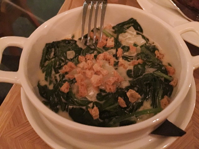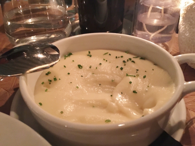 Our final dishes were a Rib Eye with Bone Marrow Gremolata and sides of a Smoky Potato Puree and Creamed Spinach. The steak was served with a Red Wine Reduction and had a nice flavorful crust. As for the sides, the potatoes were the best I have ever had with a hint of smoke and the creamiest of textures. The Spinach was nicely prepared too and I enjoyed the crunch of the mini croutons on top.