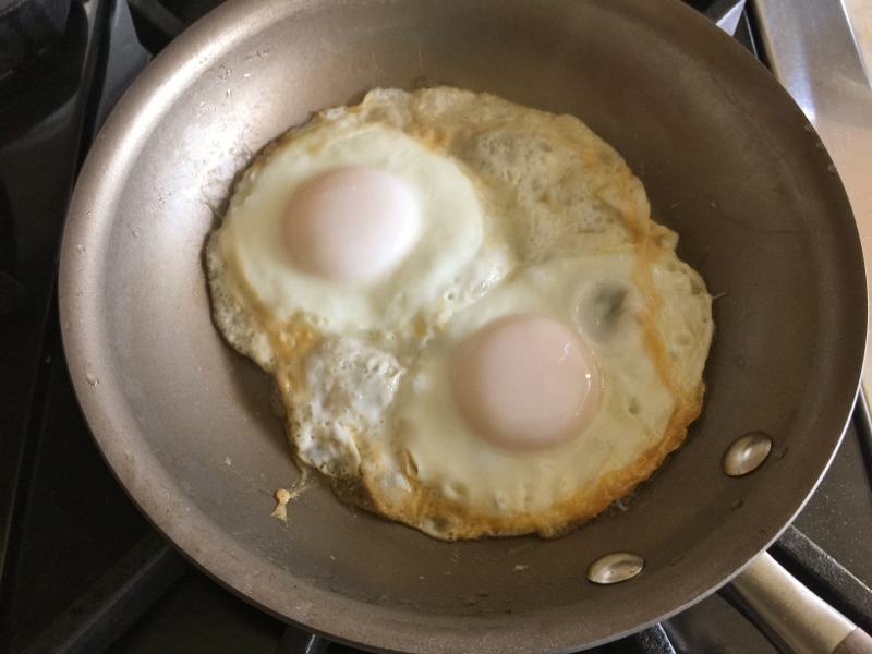 2.  Place pan over medium heat, add 1 tablespoon butter.  Crack eggs in batches and add 1/4 cup water.  Cover with lid and steam for 1 1/2 minutes or until desired doneness.  Toast bread and spread with butter.