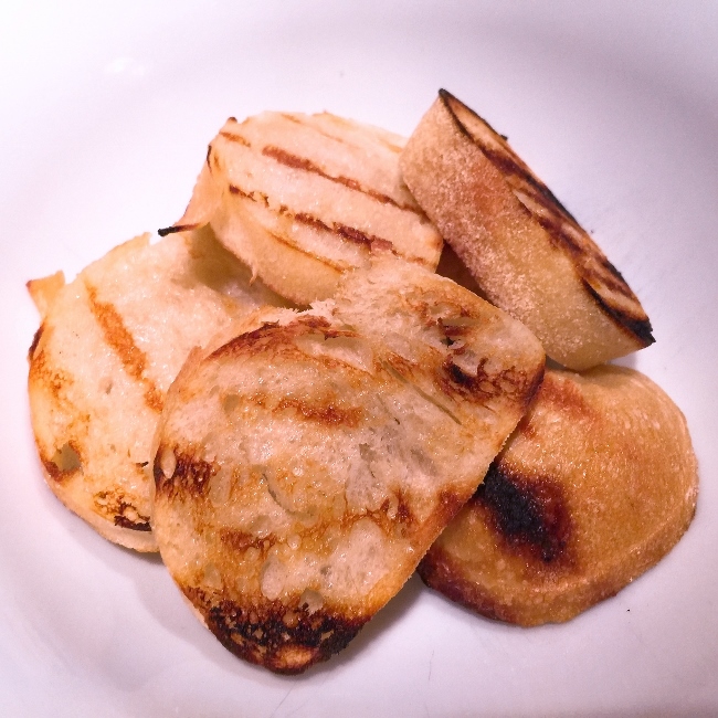 3. While cheese is baking, melt 2 tablespoons of butter and brush slices of baguette. Grill on stove top or bake in oven, until golden brown.