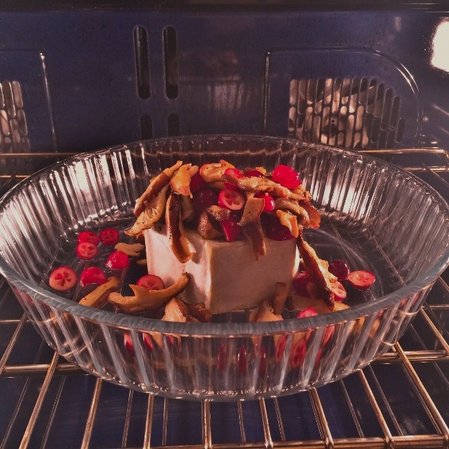 2. Slice cranberries in half and add them to pan. Sauté for 1 minute and turn off heat. Unwrap Brie and place it in an oven safe dish. Spoon mushroom and cranberry mixture over top and place in oven to bake for 15 minutes.