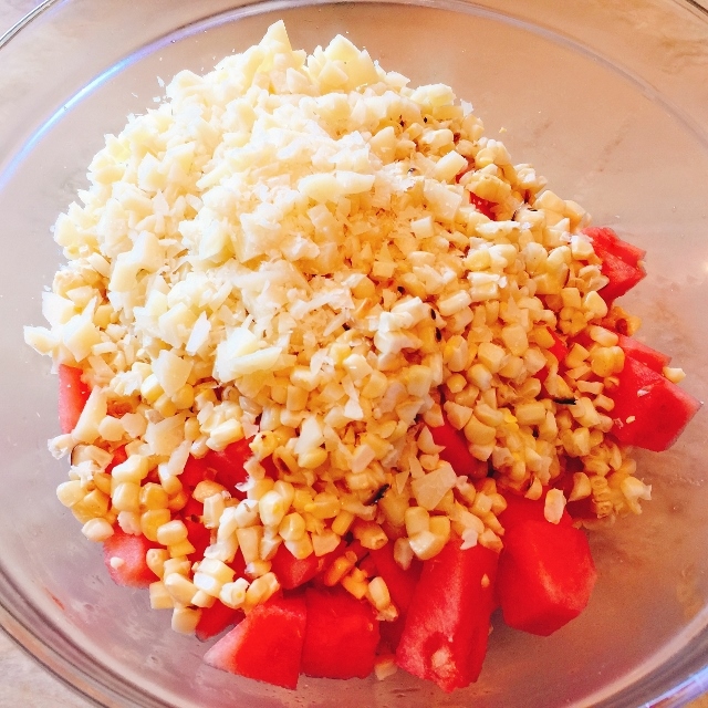 I wait all year to taste the sweet flavors of summertime watermelon and tomatoes. These two fruits are some of the sweetest seasonal ingredients, and when combined, make a spectacular salad. I noticed the beginning of fresh corn season at the farmers market, and I thought it would be fun to add some to a salad with watermelon and tomatoes, one of the best combinations of summer produce for sure.