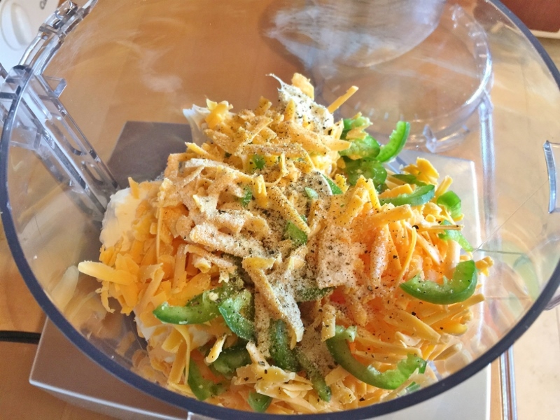 1. Slice jalapeno and remove cream cheese from any packaging. Place all ingredients, except hot sauce in a food processor.