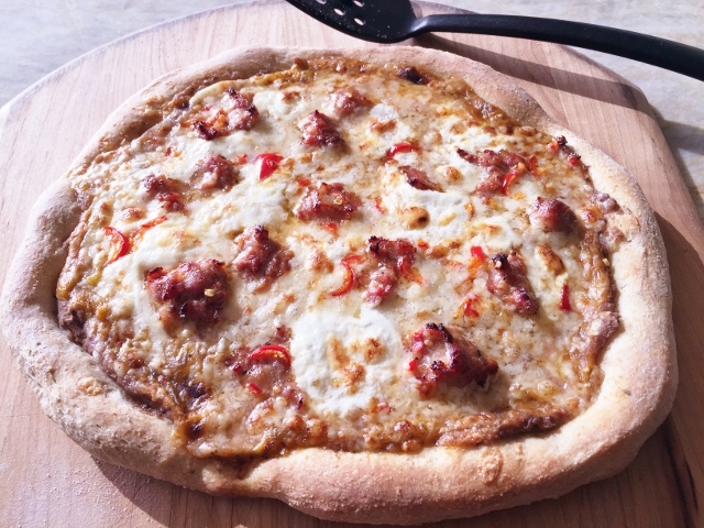 In my recipe, I start by preparing a simple dough with whole wheat and white flours with a hint of oregano. Then, I prepare a freshly roasted tomatillo salsa, it only takes minutes. The other ingredients are standard pantry items to create an festive pizza experience. I like to serve my pies with a good tequila on the rocks with a ton of sliced lime, but a crisp white wine will pair nicely too.