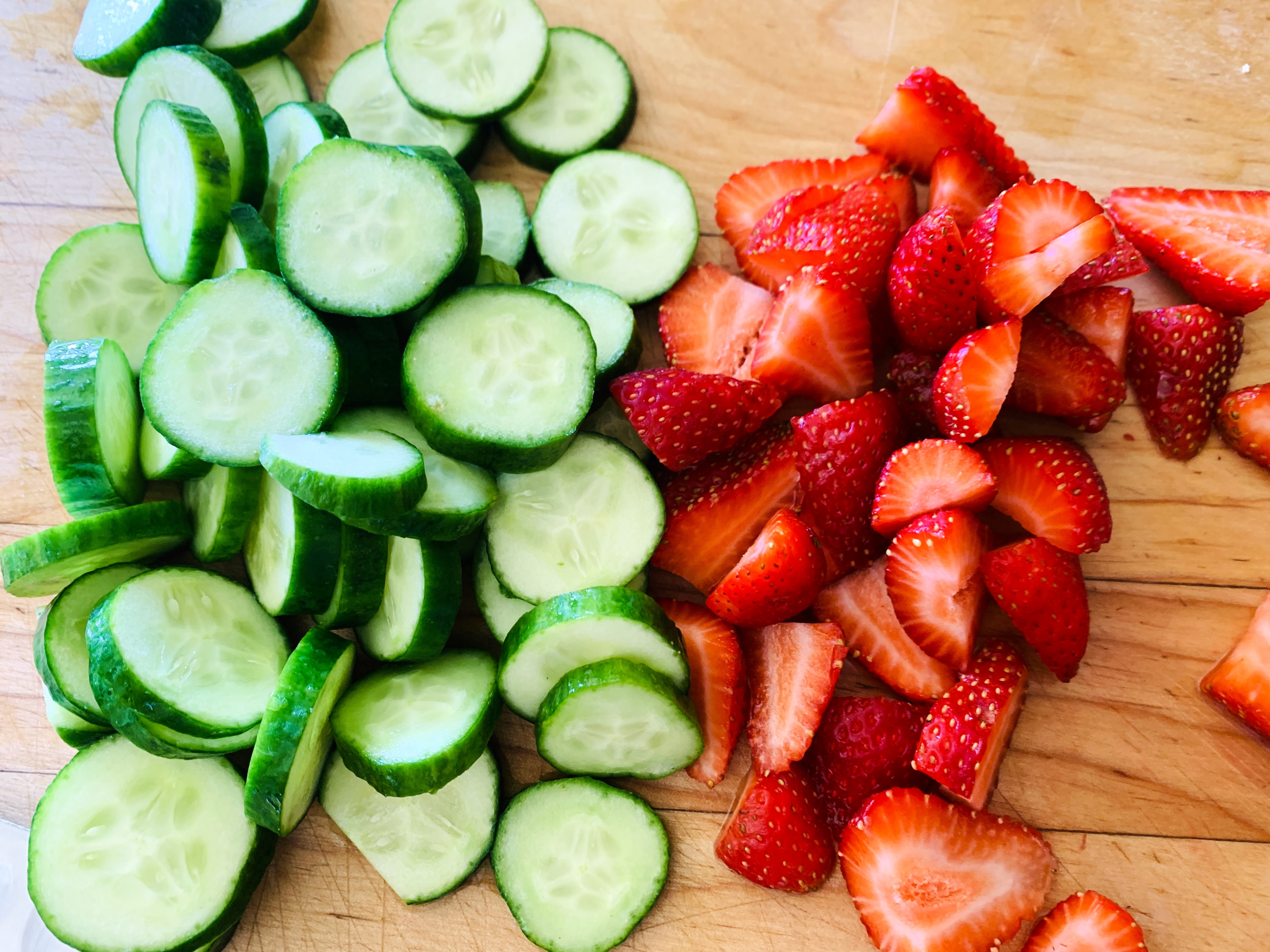 - Add sliced strawberries and cucumbers to dressing and toss until coated.