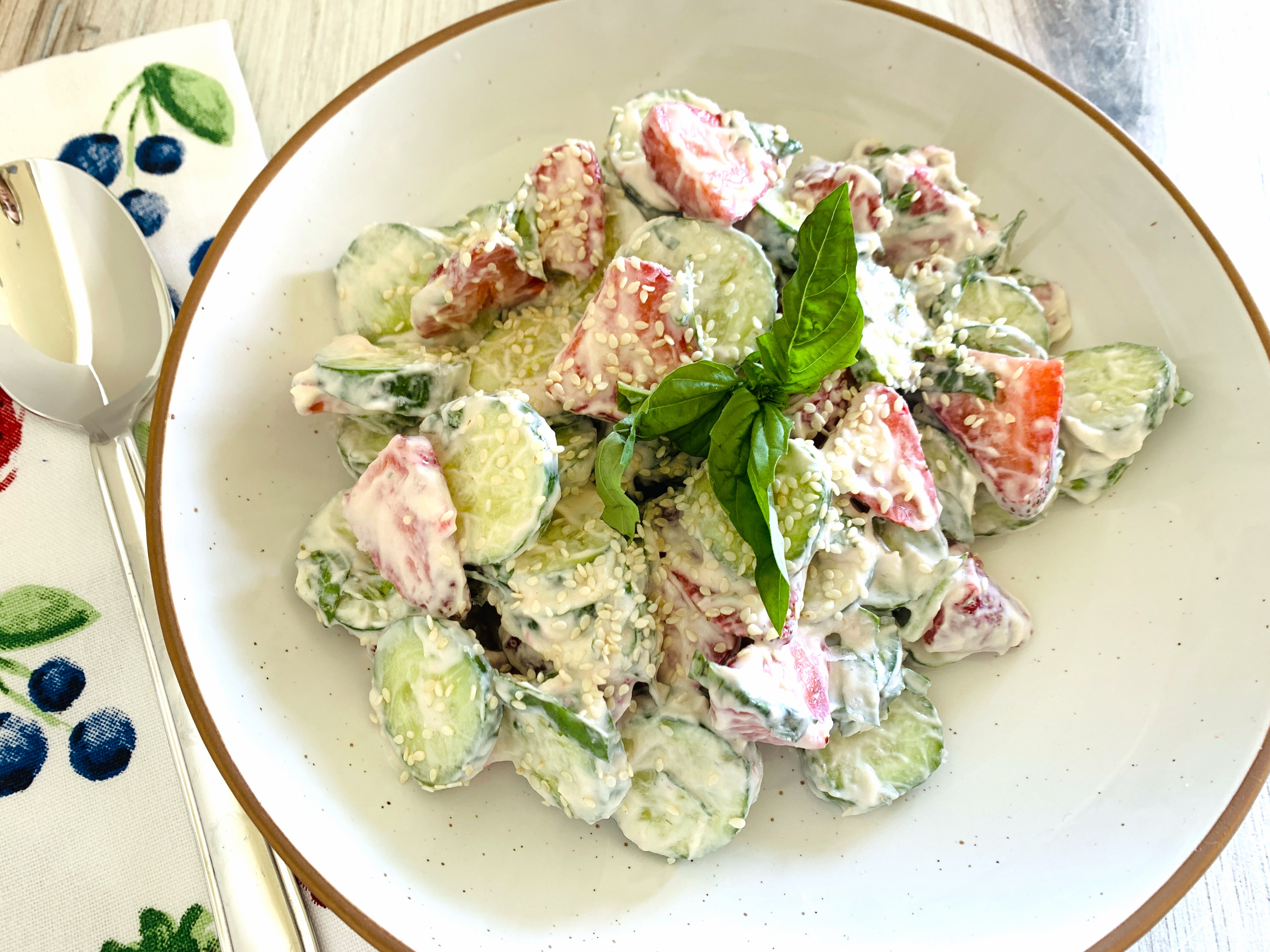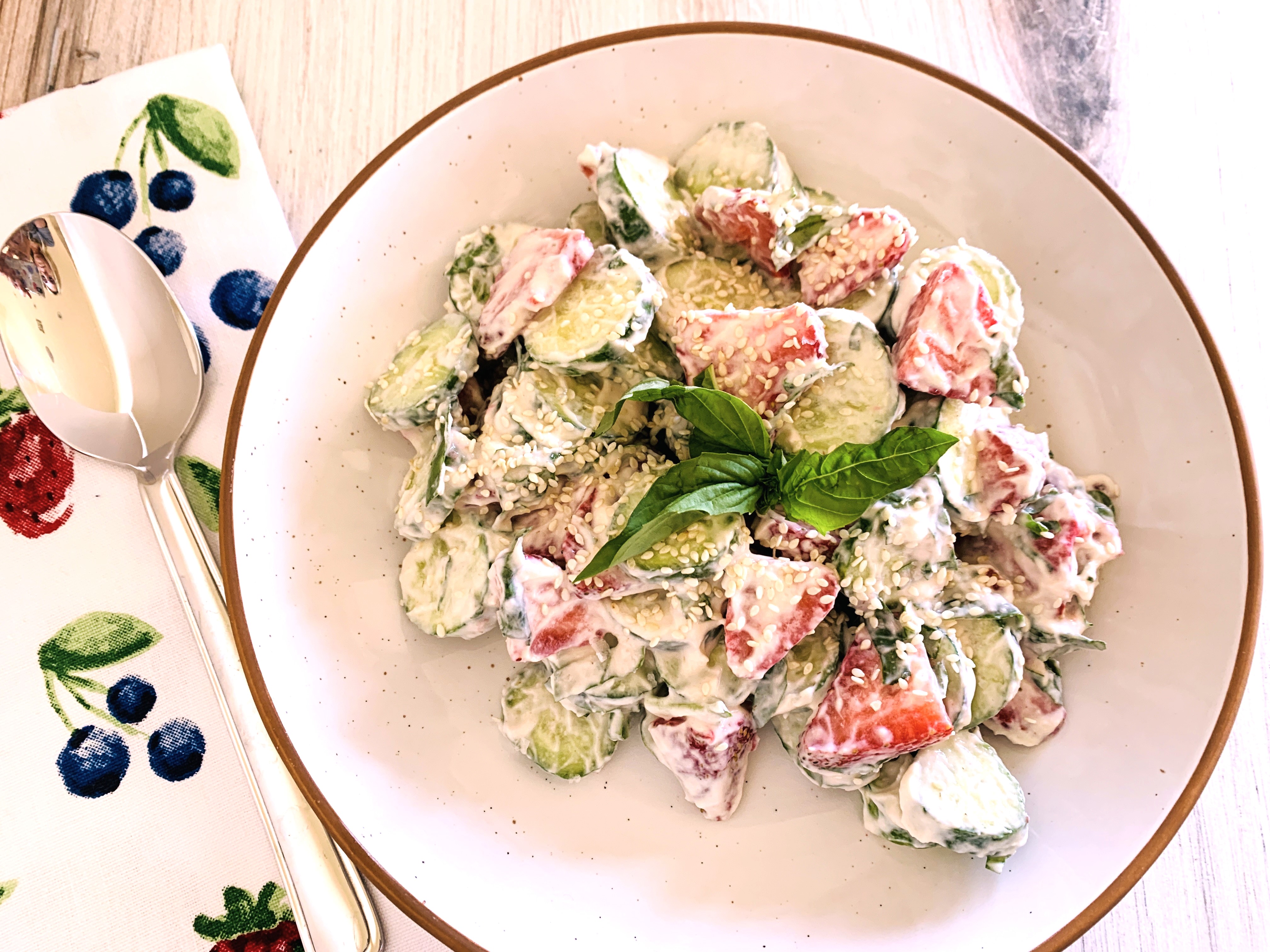 Summer salads are something I truly live for during the warm months of the year. The light and bright produce that’s so prevalent right now, shouldn’t be overlooked. Water-packed cucumber are a great way to stay hydrated, not to mention are loaded with fiber and spa-like taste. The combination of cucumbers and strawberries makes a sweet and aromatic salad that when tossed in a creamy yogurt honey tahini dressing — pops with even more flavor.