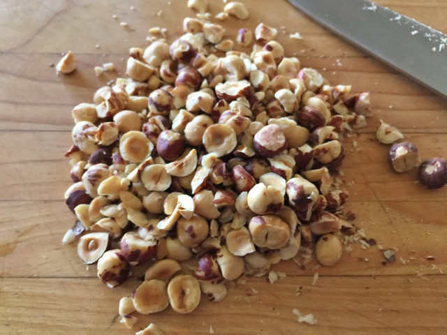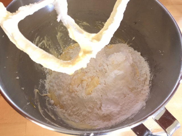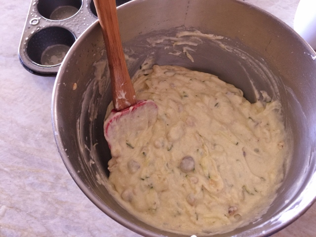 2.  Add the flour, baking powder, baking soda and salt and mix on low for 30 seconds.  Spoon in the yogurt and mix for 30 seconds.  Grate the zucchini and chop the hazelnuts.