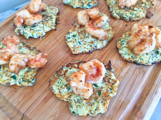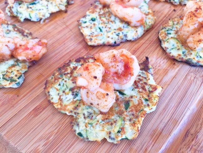 3. In a small bowl, toss shrimp with paprika, garlic powder and salt. Add butter to same sauté pan as you cooked fritters, and place over medium heat. When butter is melted, sauté shrimp for 4 minutes. Remove shrimp from heat and place 2 shrimp on top of each fritter, along with a little drizzle of melted butter from pan. Serve immediately. Enjoy!